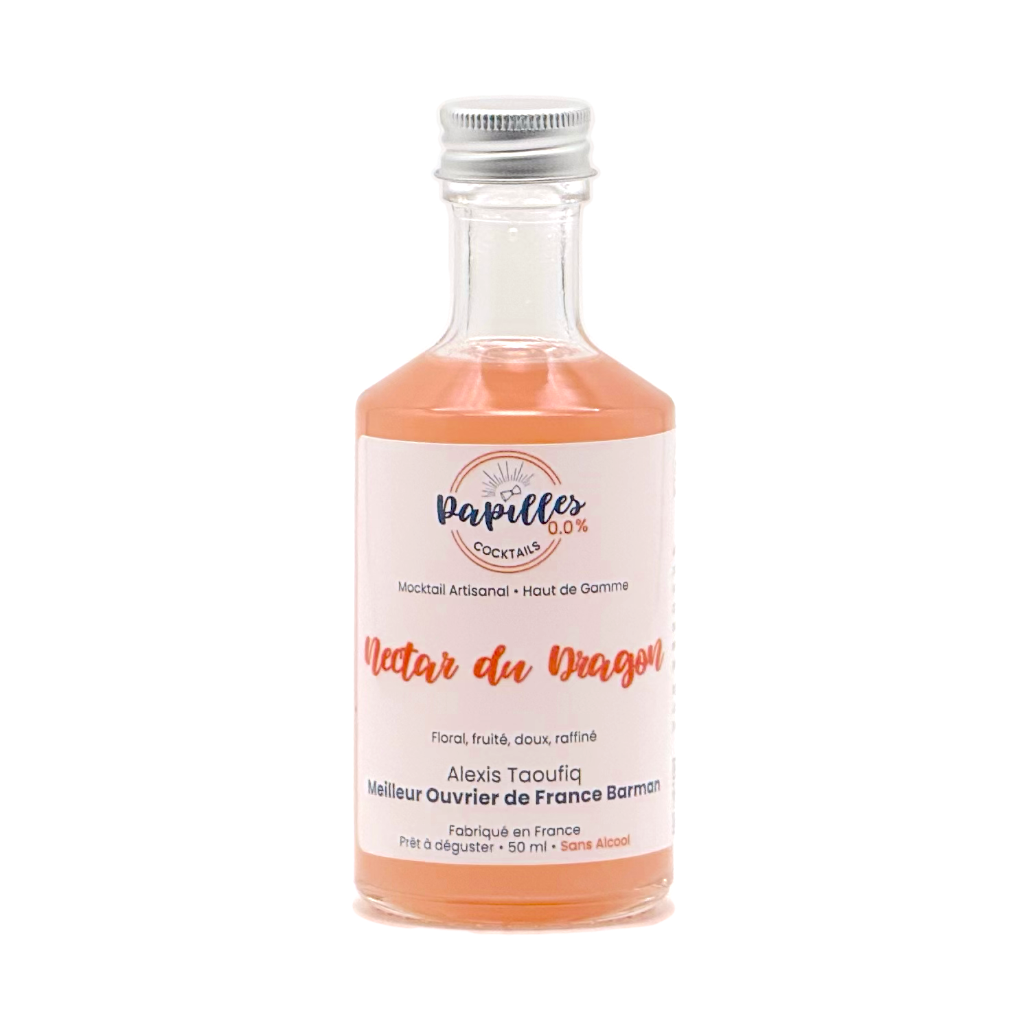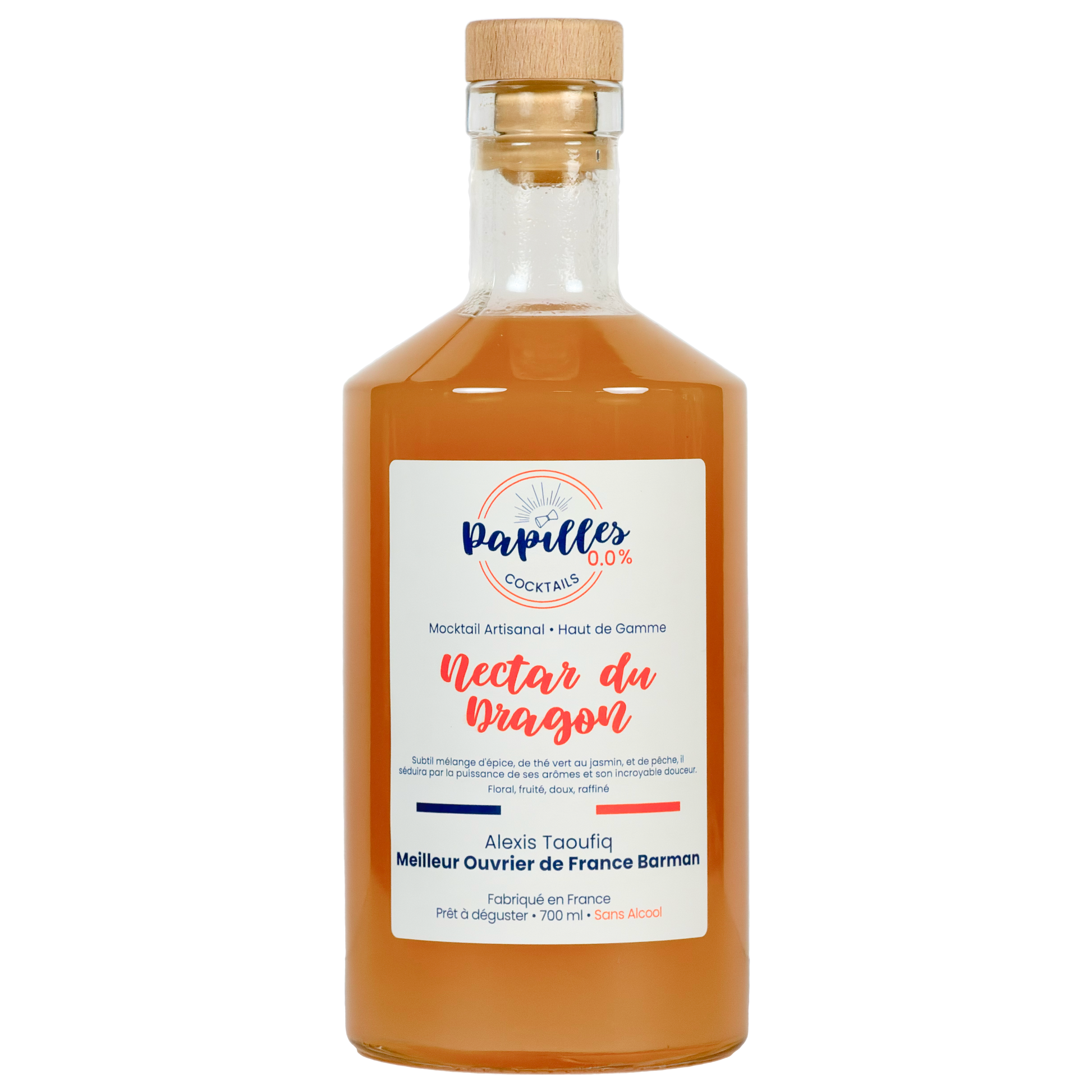 Le Nectar du Dragon est un cocktail sans alcool à la fois doux et envoûtant, né de l’alliance entre la pêche juteuse, le thé vert au jasmin et une délicate infusion d’épices. Véritable voyage sensoriel, ce mocktail artisanal séduit par la subtilité de ses arômes floraux et sa fraîcheur équilibrée, relevée d’une touche de citron frais pressé. Élaboré sans additifs, sans colorants ni conservateurs, il incarne la philosophie Papilles Cocktails : authenticité, naturalité et élégance. Une création raffinée et harmonieuse, à savourer à tout moment pour le simple plaisir du goût.