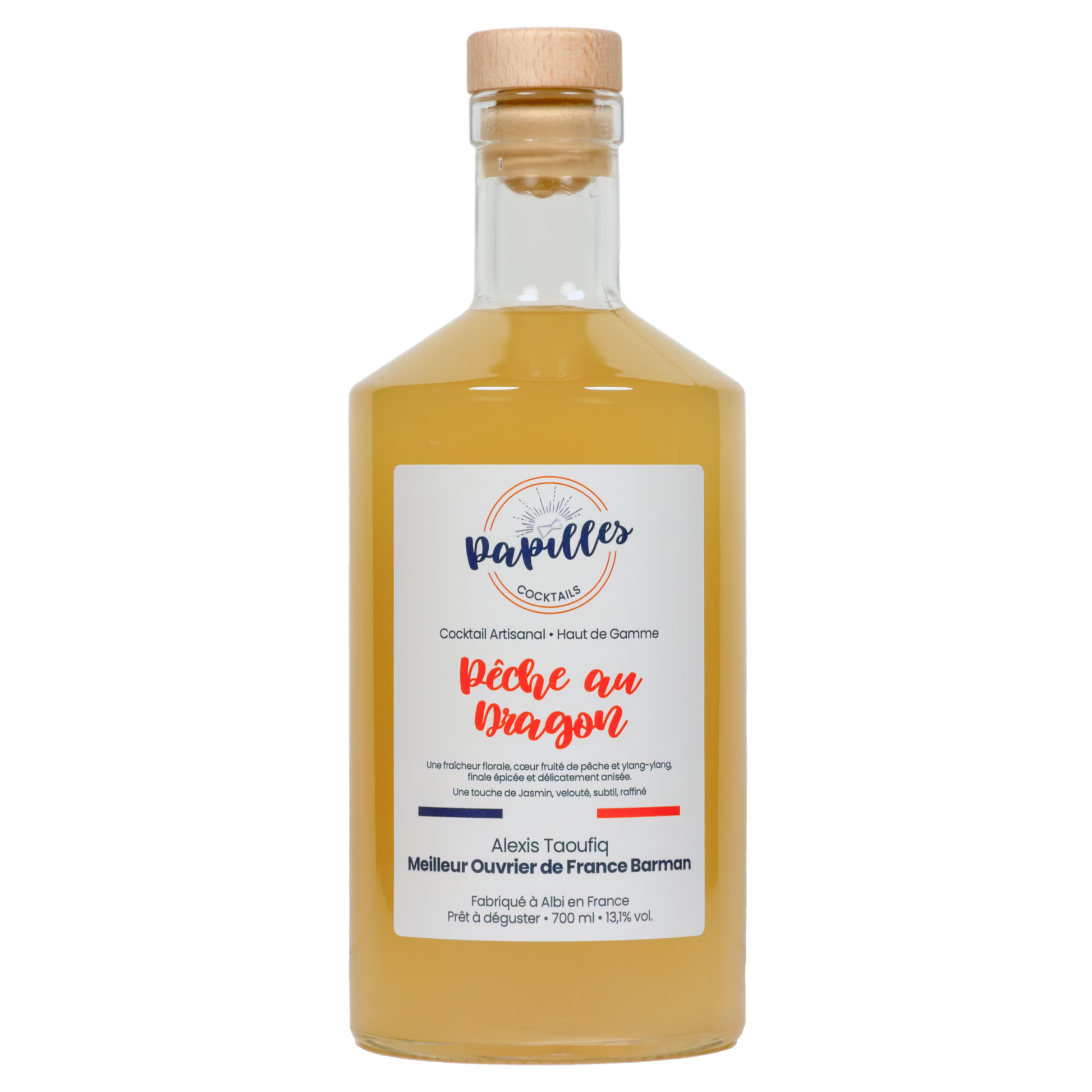 Gin français • Eau • Thé vert au Jasmin • Citrons frais pressés • Sucre • Liqueur de Pêche • Boisson spiritueuse absinthe • Ylang ylang • Epices