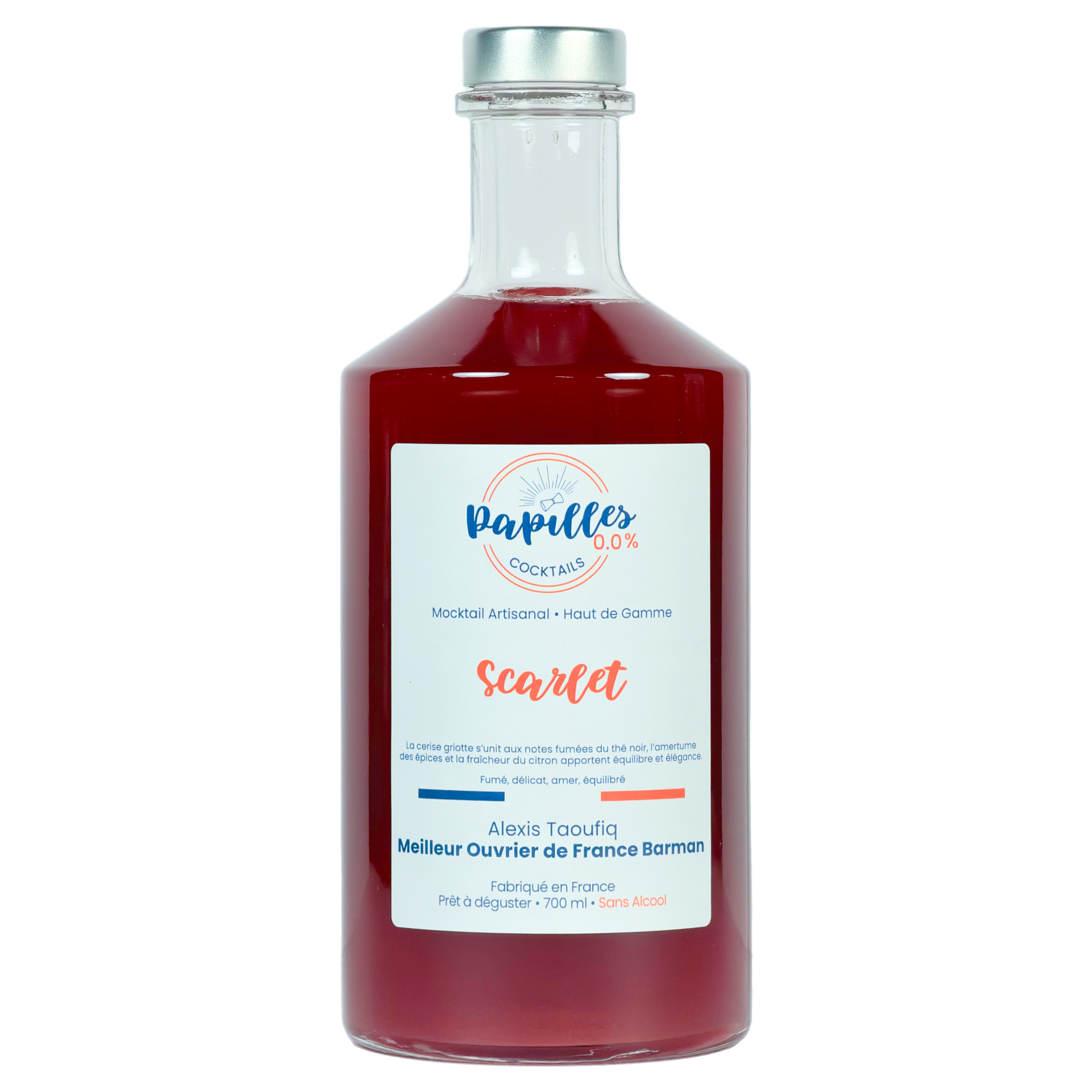 Le Scarlet est un cocktail sans alcool d’une profondeur aromatique unique, où la cerise griotte révèle toute sa gourmandise face au caractère fumé du thé noir Lapsang Souchong. L’équilibre parfait entre l’amertume élégante du bitter maison aux épices et la fraîcheur vive du citron confère à ce mocktail artisanal une complexité rare et raffinée. Sans additifs, sans colorants ni conservateurs, le Scarlet incarne la signature Papilles Cocktails : des créations naturelles, authentiques et pleines de caractère, pensées pour éveiller les sens et séduire tous les palais.